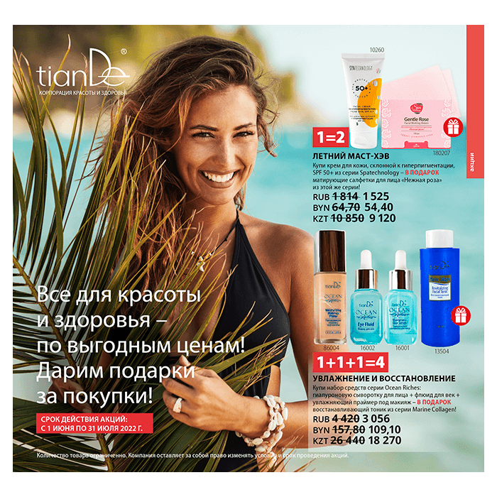 Средства для ухода за кожей лица и тела, продукты рационального питания, декоративная косметика, уход за волосами, полостью рта, продукты линии здоровья и многое другое. Хочется все! Как же приятно, когда можно получать подарки за свои покупки! Щедрые акции от TianDe* позволят приобрести все для красоты и здоровья по выгодным ценам. Акции – это возможность попробовать то, что вы не пробовали ранее, повод купить подарки самым близким и надежный способ усилить свой арсенал средств ухода. Кроме этого, товарные акции – важнейший инструмент развития бизнеса. Впусти в свою жизнь больше возможностей. Используй акции и наполняй ее приятными событиями. * Срок действия акций: с 1 июня по 31 июля 2022 г.