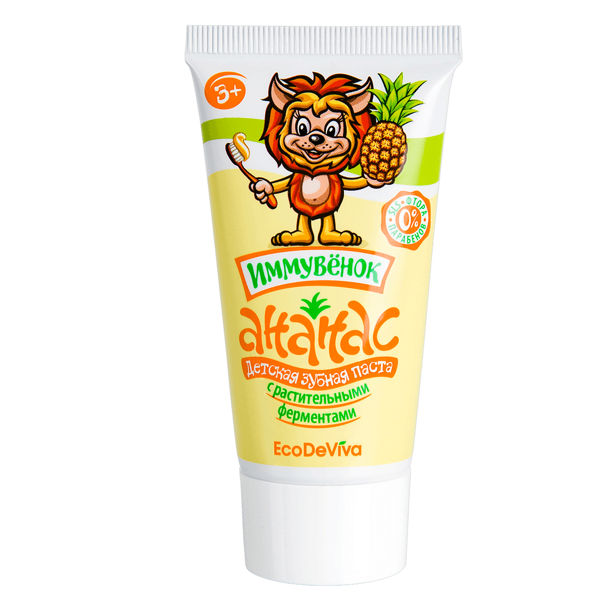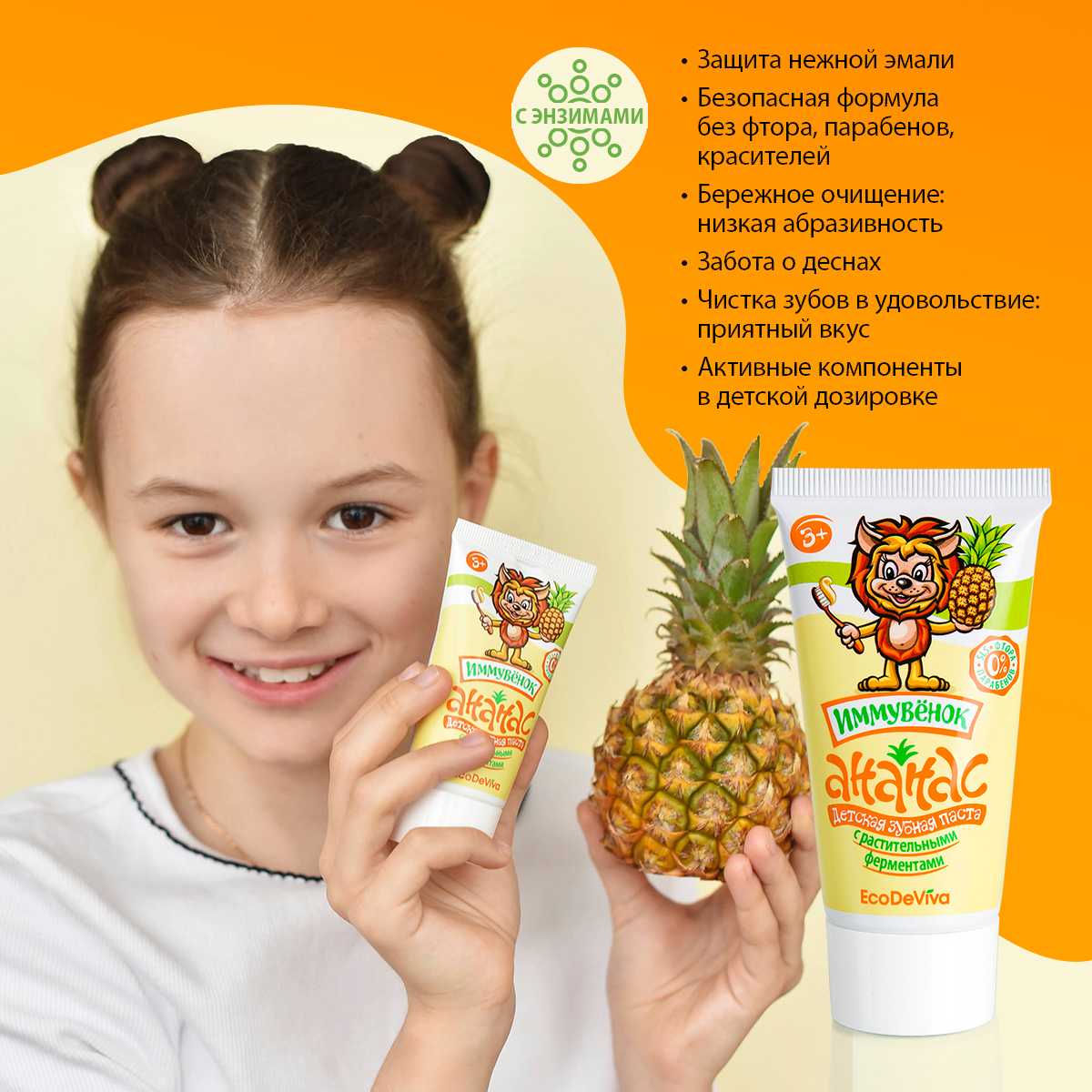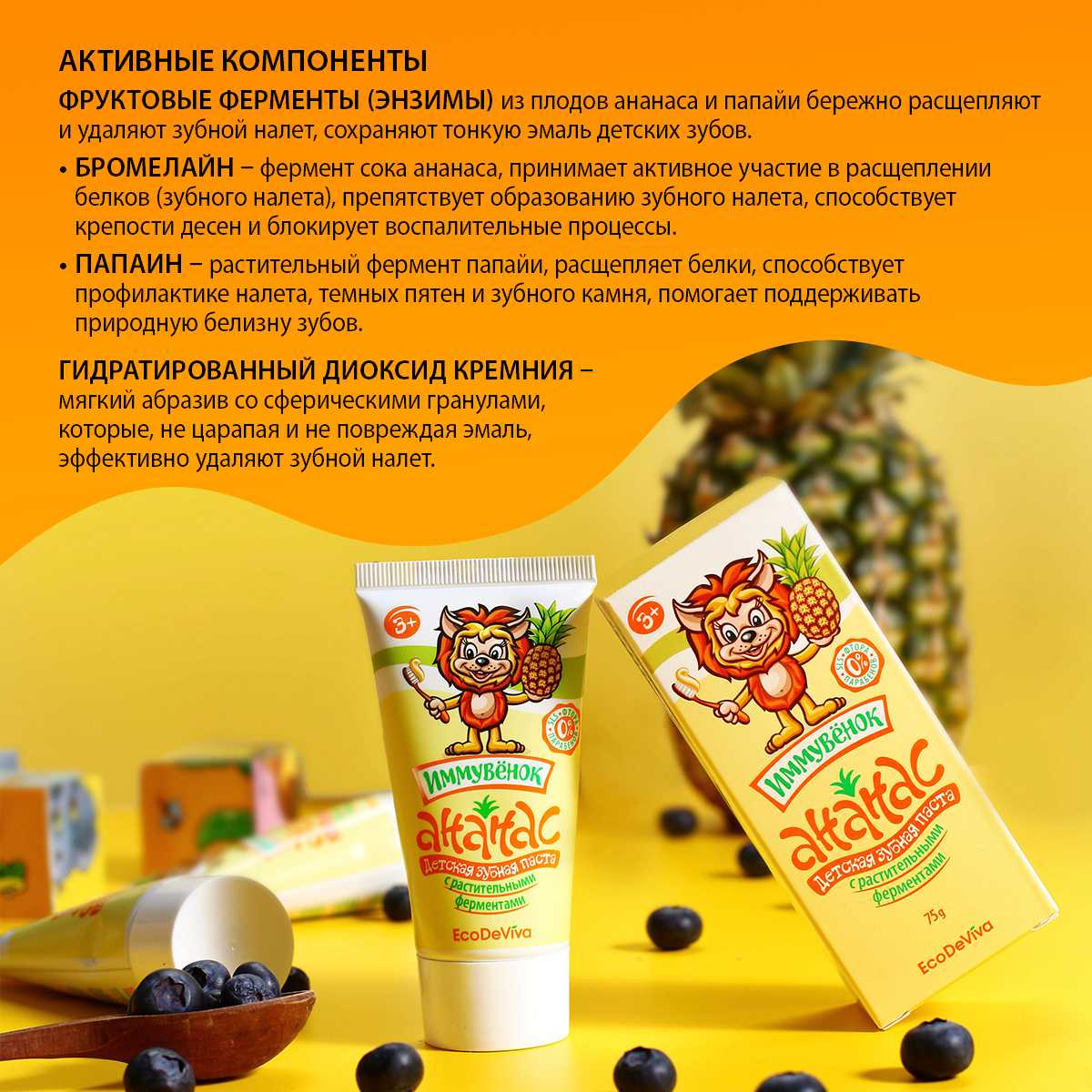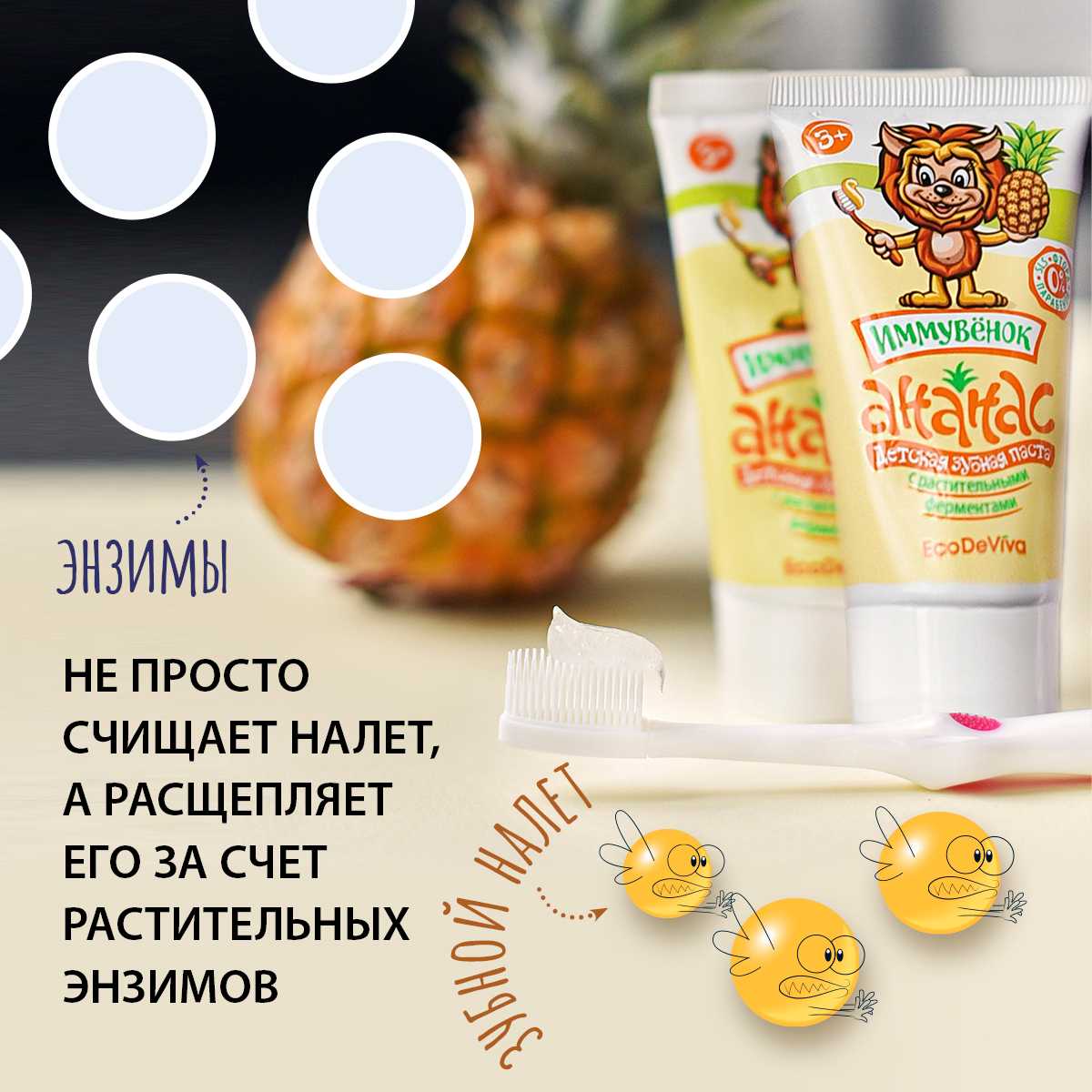 Теперь прививать правильные привычки будет еще легче и веселее. В этом вам поможет уже знакомый «Иммувенок»! Он станет другом для ваших деток, а для вас – надежным помощником! Вы выбираете качество, а ваши дети – приятный вкус и чистку зубов как веселую игру! Детская зубная паста «Ананас» – это безопасная формула без фтора, парабенов, красителей и SLS, это комплексное действие и эффективность. Она содержит активные компоненты в «детской» дозировке, учитывающей особенности полости рта ребенка. Благодаря содержанию энзимов (фруктовых ферментов) из плодов ананаса и папайи паста расщепляет и мягко удаляет зубной налет, а не просто счищает его. Зубная паста «Ананас» обеспечивает тщательную гигиену полости рта, защищая зубки и обеспечивая эффективную профилактику кариеса.