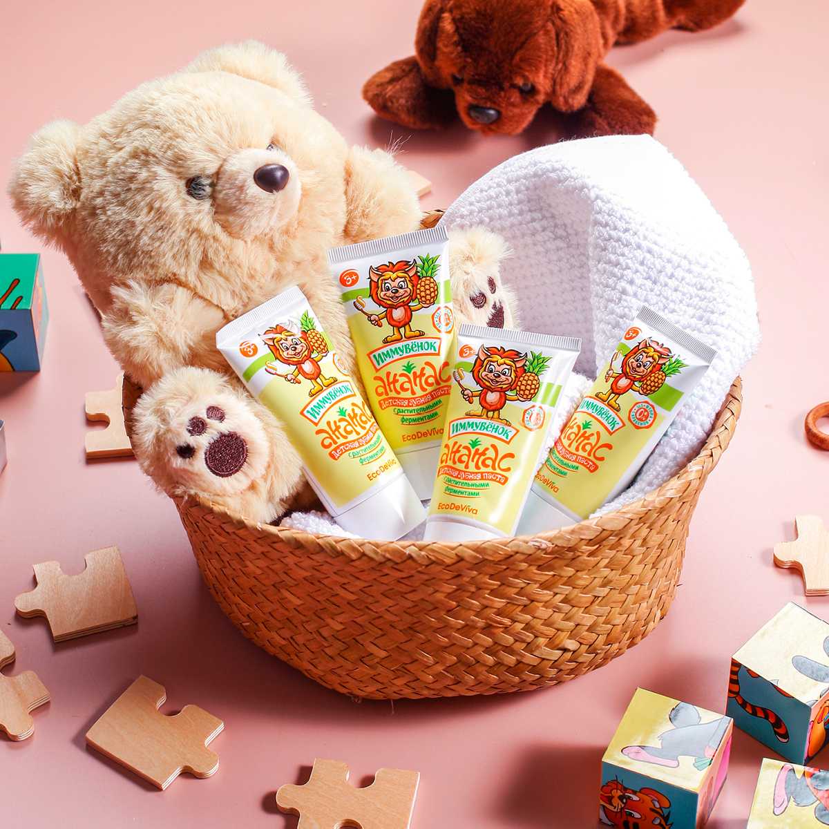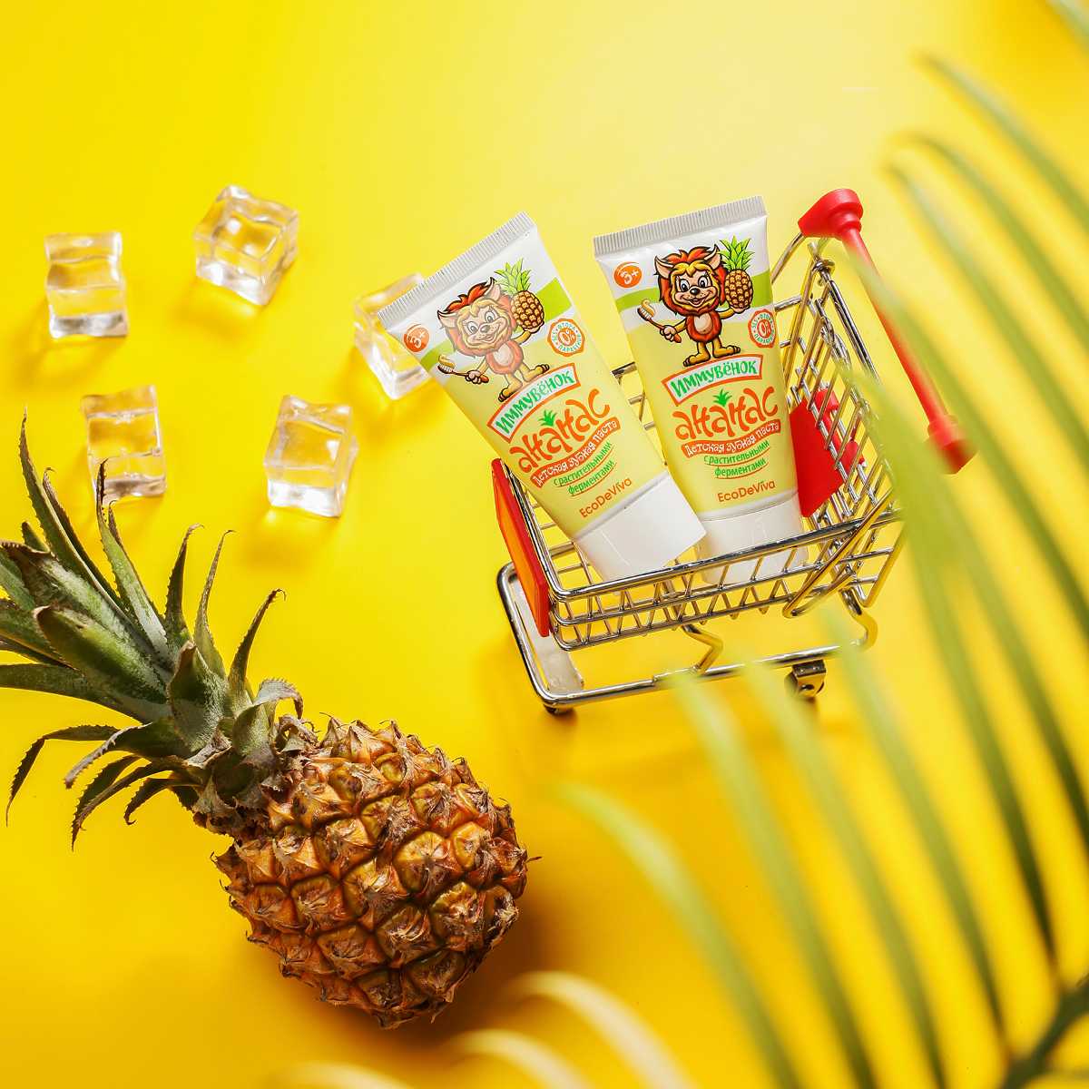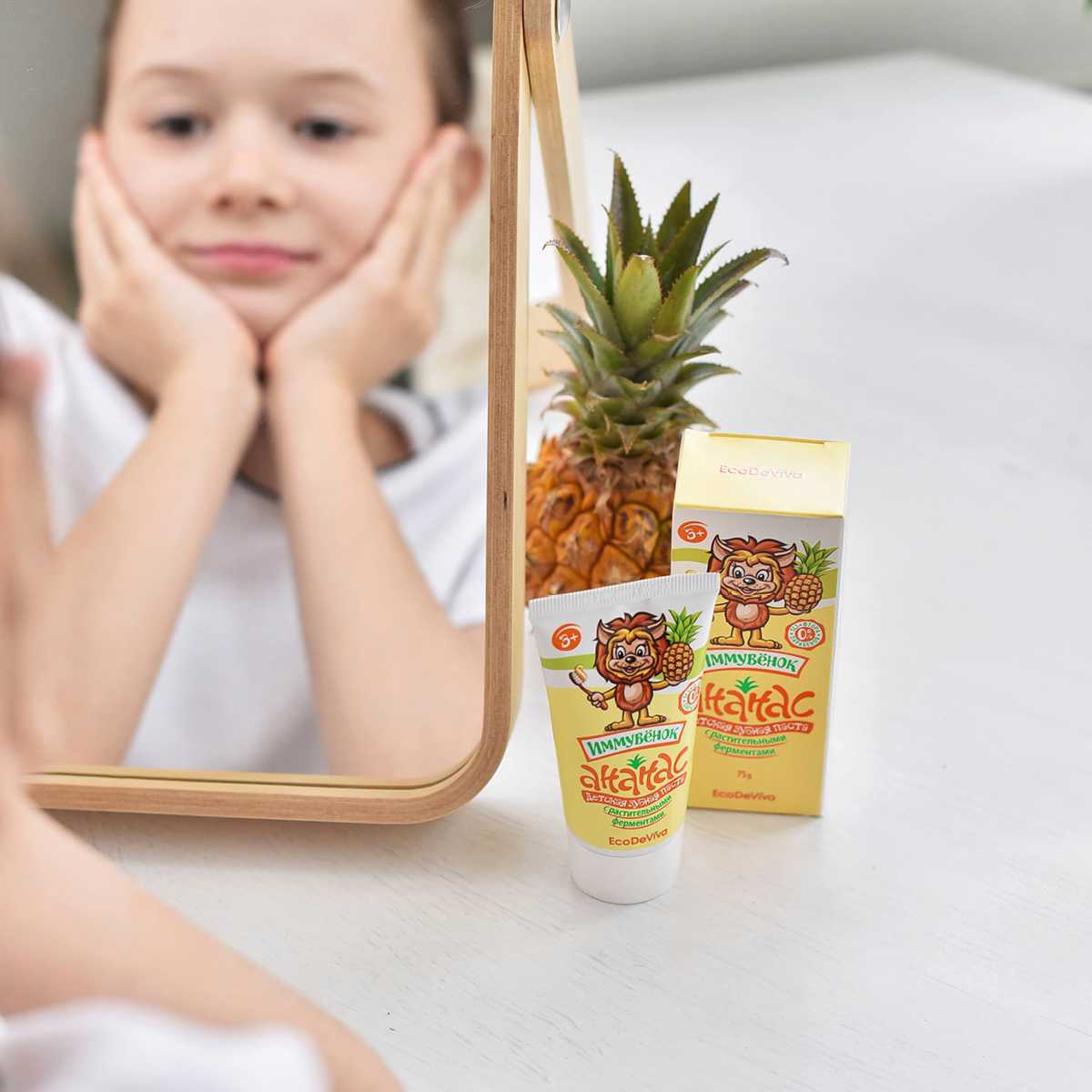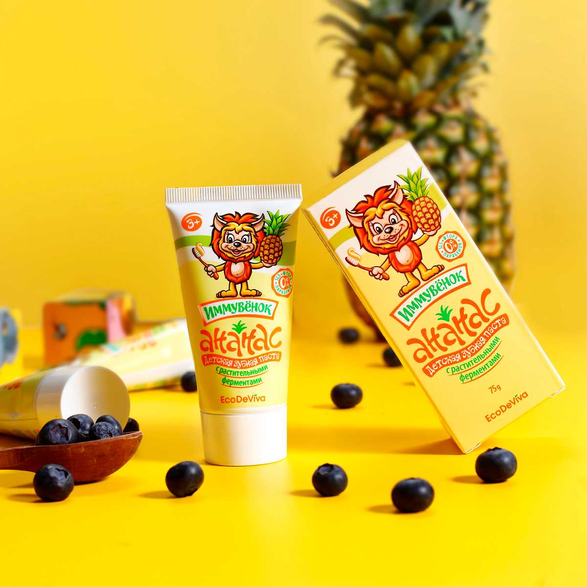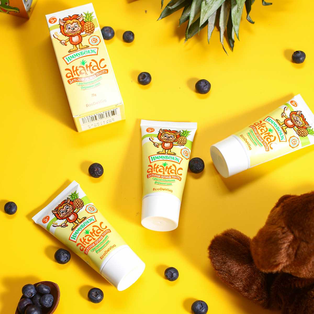 Теперь прививать правильные привычки будет еще легче и веселее. В этом вам поможет уже знакомый «Иммувенок»! Он станет другом для ваших деток, а для вас – надежным помощником! Вы выбираете качество, а ваши дети – приятный вкус и чистку зубов как веселую игру! Детская зубная паста «Ананас» – это безопасная формула без фтора, парабенов, красителей и SLS, это комплексное действие и эффективность. Она содержит активные компоненты в «детской» дозировке, учитывающей особенности полости рта ребенка. Благодаря содержанию энзимов (фруктовых ферментов) из плодов ананаса и папайи паста расщепляет и мягко удаляет зубной налет, а не просто счищает его. Зубная паста «Ананас» обеспечивает тщательную гигиену полости рта, защищая зубки и обеспечивая эффективную профилактику кариеса.