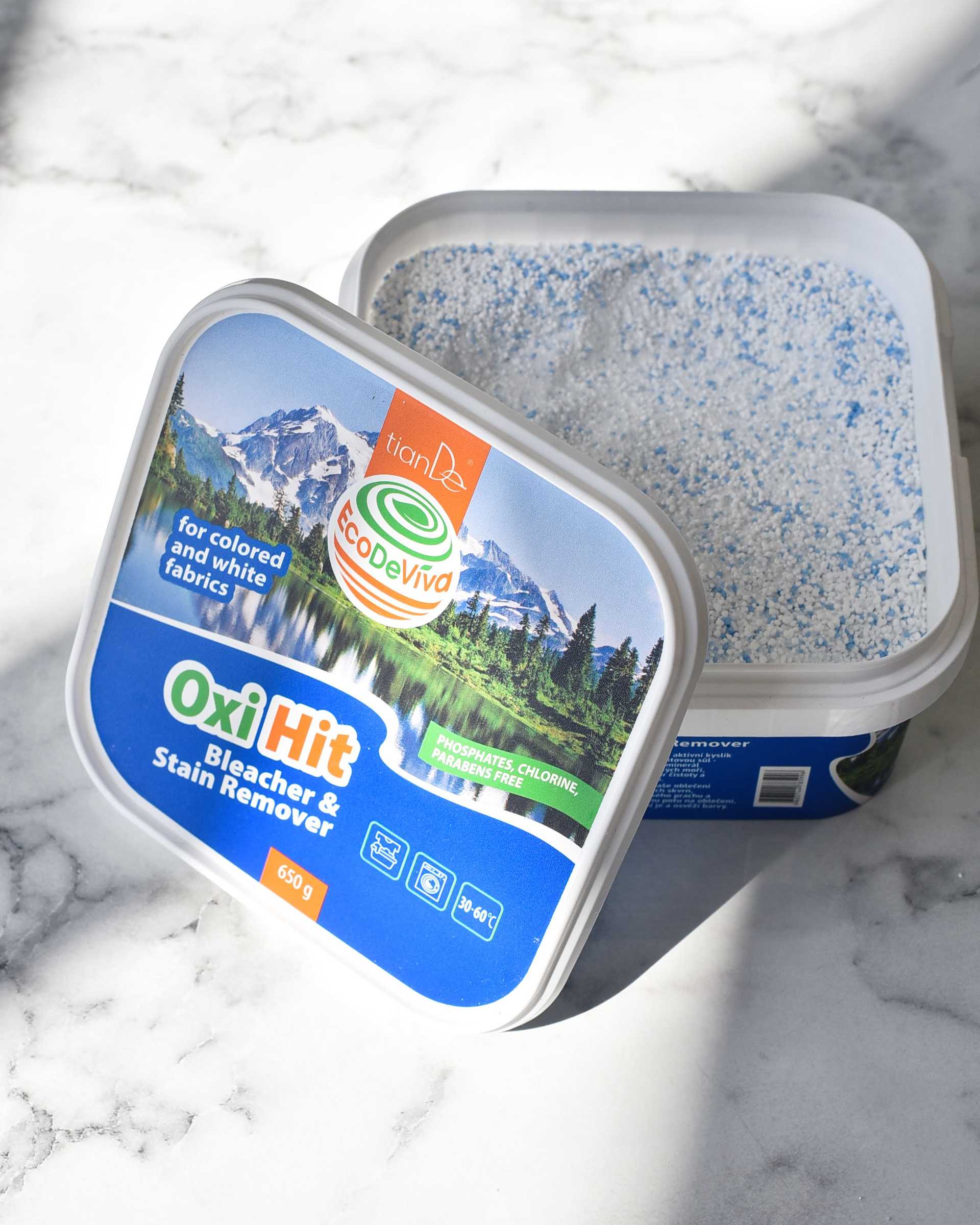 Перед использованием порошок в банке следует перемешать. Не применяйте вместе со средствами, содержащими хлор! Протестируйте средство на незаметном участке ткани перед использованием.