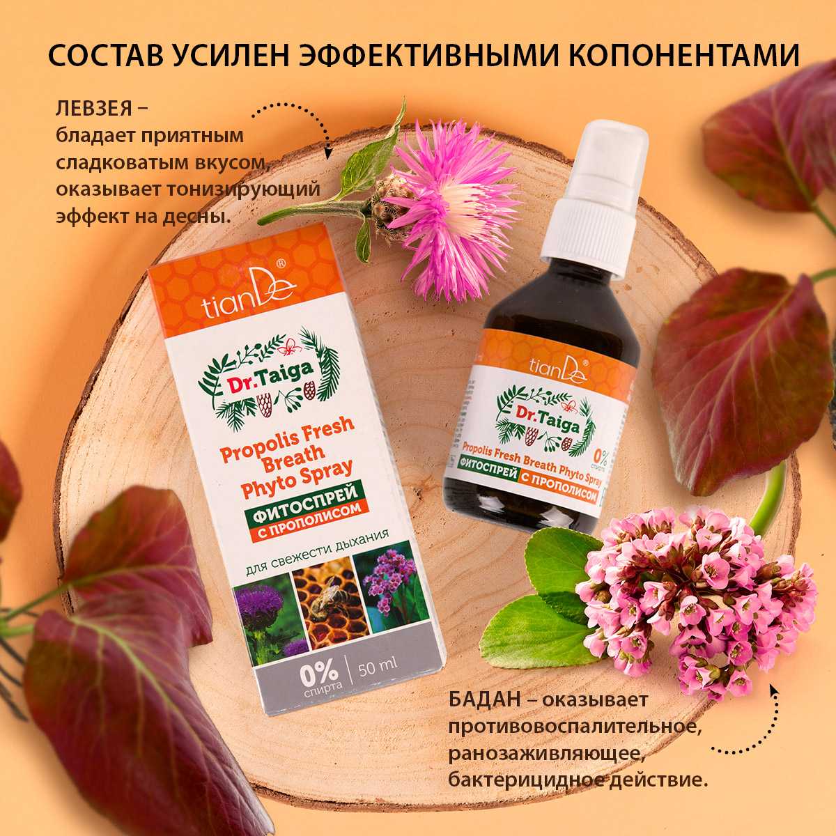 Фитоспрей с прополисом борется с причиной возникновения неприятного запаха и проблем ротовой полости – с бактериями. Он не маскирует проблему, а день за днем улучшает состояние десен и слизистой полости рта. Это средство эффективно работает благодаря содержанию на 100% натурального прополиса высокой степени очистки. Он известен своими бактерицидными и регенерирующими свойствами. Для усиления эффекта мы добавили в спрей левзею (маралий корень) и бадан. Фитоспрей можно использовать не только для свежести дыхания, решения проблем полости рта и борьбы с болезнетворными бактериями, но и в качестве местного антисептика. Он НЕ СОДЕРЖИТ СПИРТА, изготовлен на водной основе! Благодаря удобному распылителю расход средства будет очень экономичным. Его хватит примерно на 250 распылений.