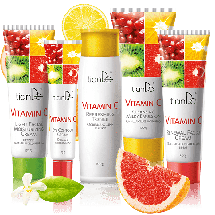 Включите в рацион своей кожи "кисленькое" - витамин С. Он сохраняет молодость клеток, защищает их от свободных радикалов, выравнивает и освежает цвет лица, способствует устранению акне, шелушений и других проблем. Рекомендован для использования с 20 лет. В наборе: 1. Очищающее молочко удаляет загрязнения и макияж, не повреждая гидролипидную мантию кожи и не оставляя ощущения стянутости. 2. Освежающий тоник очищает удаляет остатки косметики, подготавливает кожу к нанесению крема. 3. Легкий увлажняющий крем выравнивает цвет лица, улучшает тонус и тургор кожи, замедляет процессы ее старения. 4. Восстанавливающий крем стимулирует регенерацию клеток, увлажняет кожу во время сна, предотвращает процесс преждевременного увядания кожи. 5. Крем для контура глаз предотвращает возникновение морщинок, питает, стимулирует регенеративные процессы.