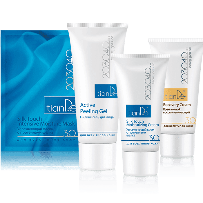 Коллекция средств "203040…" поможет уменьшить видимость морщинок, активизировать процессы регенерации кожи лица, защищить ее от воздействия агрессивных факторов окружающей среды. В наборе: 1. Пилинг-гель для лица (активный) обеспечивает отшелушивание ороговевших клеток кожи, активизирует регенерацию клеток и естественные механизмы увлажнения, укрепляет эластичность кожи, сужает поры. 2. Увлажняющий крем с протеинами шелка улучшает рельеф кожи, делает ее более упругой и эластичной, обеспечивает интенсивное увлажнение. 3. Увлажняющая маска с протеинами шелка интенсивно увлажняет и разглаживает кожу. Уменьшает видимость возрастных изменений. 4. Крем ночной восстанавливающий. Его активные компоненты способствуют восстановлению целостности структуры дермы, стимулируют регенерацию клеток, улучшают цвет кожи.