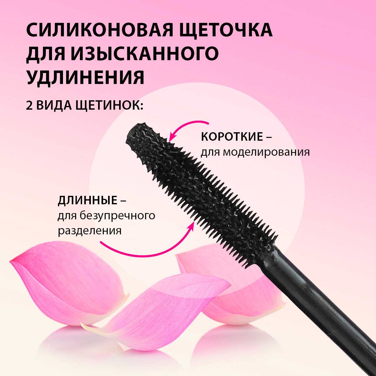 Полимерная щеточка нового поколения изгибается под разными углами: фиксирует изгиб, приподнимает ресницы для открытости взгляда, идеально прокрашивает каждую ресничку. Легко снимается обычной водой.