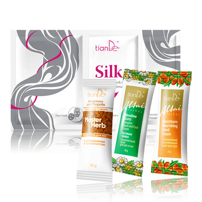 Кремы для рук и ног, созданные на Алтае – в одном из самых экологически чистых мест планеты, будут бережно заботиться о нежности и красоте кожи. Их экономичная упаковка-саше позволит использовать средство до последней капли. Приобретая сразу 3 продукта в формате саше, ты не только сэкономишь на упаковке, но и получишь подарок – «шелковую» маску для лица и шеи.