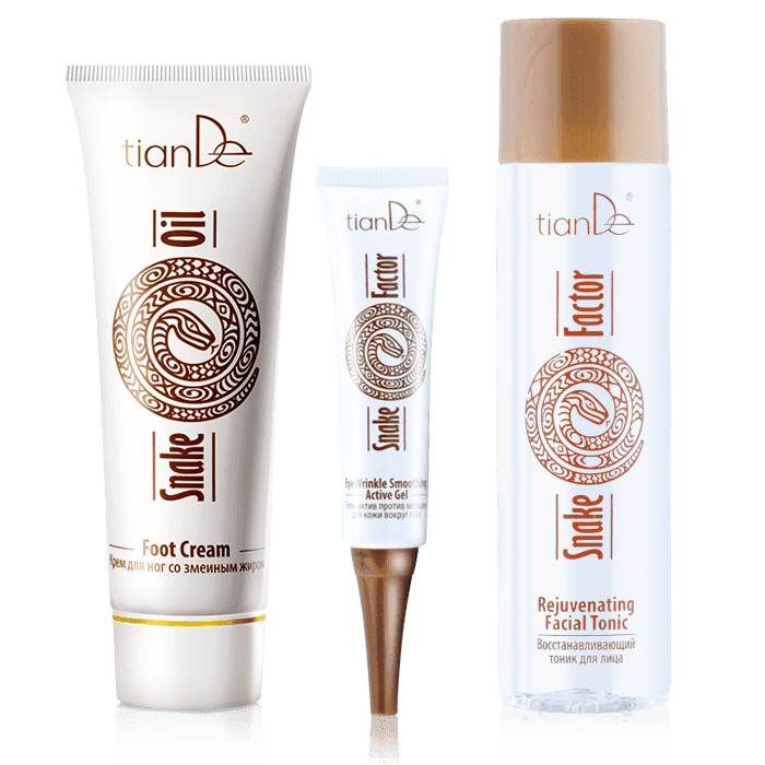 Хочешь расстаться с возрастом также легко, как змея сбрасывает кожу? Серия SnakeFactor тебе в этом поможет! В составе средств этой линейки – масло змеи мамуши, источник полиненасыщенных жирных кислот омега-3, необходимых для производства здоровых клеток,и уникальный Anti-agecomplex с ретинолом и аденозином. Ухаживая за лицом, не забывай про ручки и ножки – доверь заботу о них TianDe! Условия Купи два любых средства для лица из серии SnakeFactor – В ПОДАРОК крем со змеиным жиром на выбор: для ног или для рук! 1 + 1 = 3