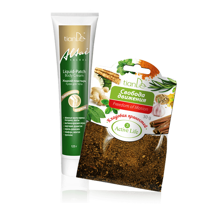В составе крема для тела «Жидкий пластырь» собраны самые «суставные» компоненты. Благодаря им крем оказывает усиленный разогревающий эффект и благотворно воздействует на мышцы, суставы и связки. Как можно дольше сохранять гибкость и подвижность поможет кладовая пряностей «Свобода движения». Вместе с TianDe быть активным не просто полезно, но и выгодно – кладовую пряностей «Свобода движения» ты получишь в подарок! Условия Купи крем для тела «Жидкий пластырь» – В ПОДАРОК кладовая пряностей «Свобода движения»! 1 = 2 Количество товара ограниченно. Компания оставляет за собой право изменять условия и срок проведения акций.