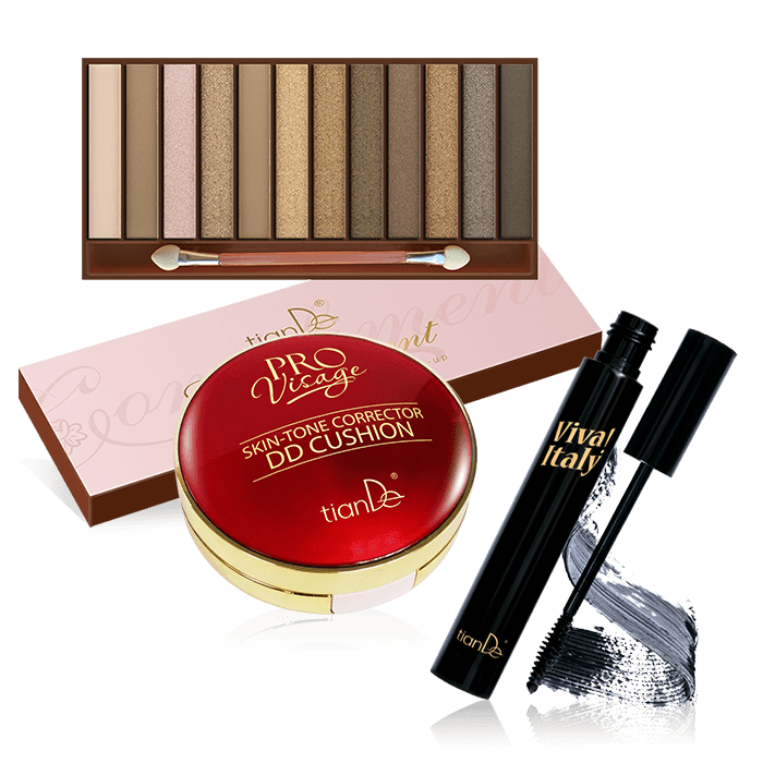 Всего три средства из косметички – и ты неотразима! Шаг 1: безупречный тон. Воспользуйся кушоном от TianDe – он идеально сольется с цветом лица и замаскирует все несовершенства. Шаг 2: «теневая политика». Для ежедневного использования отлично подходит набор теней для натурального макияжа, для эффектного выхода в свет выбирай набор для подиумного мейкапа. Шаг 3: роскошные ресницы. Финальный штрих макияжа – тушь для ресниц. Viva Italy удлинит ресницы и придаст им пикантный изгиб. Этой осенью стать девушкой с обложки легко и выгодно! Забирай тушь Viva Italy бонусом! Условия Купи DD тональное средство – кушон + набор теней для натурального – В ПОДАРОК тушь Viva Italy! 1 + 1 = 3 Количество товара ограниченно. Компания оставляет за собой право изменять условия и срок проведения акций.
