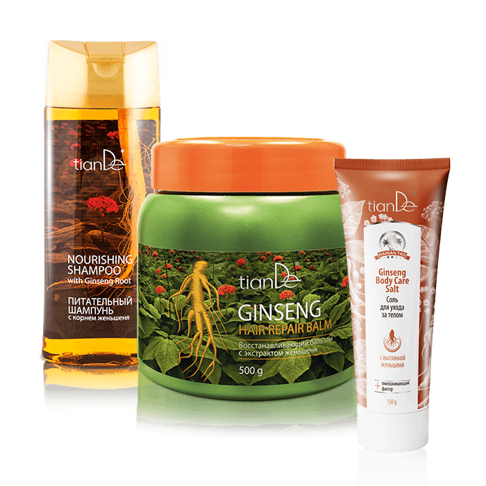 На Востоке женьшень называют «корнем жизни» – настолько разнообразными и полезными свойствами он обладает! Шампунь и бальзам с корнем женьшеня от TianDe преобразят твои волосы, восстановят их структуру и насытят комплексом витаминов и микроэлементов. Для ухода за телом воспользуйся солью с женьшенем Hainan Tao – она бережно очистит кожу и придаст ей эластичность. Наслаждайся шелком волос и бархатом тела, вместе с TianDe это выгодно! Условия Купи два средства для волос: питательный шампунь с корнем женьшеня + восстанавливающий бальзам с экстрактом женьшеня – В ПОДАРОК соль для ухода за телом с женьшенем Hainan Tao! 1 + 1 = 3