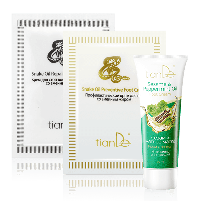 Заботишься о своих ножках? Правильно делаешь! Твои пяточки должны быть мягкими и нежными! Кремы от TianDe со змеиным жиром – настоящее спасение для жесткой, потрескавшейся кожи. Змеиный жир – источник жирных кислот омега-3, которые не синтезируются в организме человека, но являются незаменимыми в процессе образования новых клеток. Займись интенсивным восстановлением своей кожи! В подарок за нежную заботу ты получишь крем для ног «Сезам и мятное масло»! Условия Купи шесть пакетиков крема со змеиным жиром: для стоп восстанавливающего или профилактического для ног – В ПОДАРОК крем для ног «Сезам и мятное масло»!