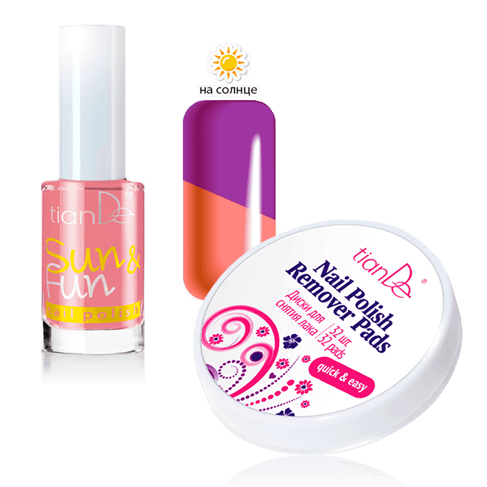 Ты яркая и современная? Хочешь, чтобы и твой маникюр был таким же? Легко! Лаки для ногтей Sun & Fun созданы специально для тебя. 2 оттенка в 1 флаконе! Лак меняет цвет при ярком свете солнца. Качественно и деликатно удалить лак помогут диски от TianDe, которые ты получишь бонусом! Условия Купи лак для ногтей Sun & Fun – В ПОДАРОК диски для снятия лака! 1 = 2 Количество товара ограниченно. Компания оставляет за собой право изменять условия и срок проведения акций.