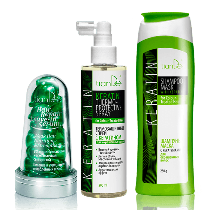 Любишь всевозможные укладки и модное окрашивание? А по нраву ли они твоим волосам? Средства TianDe созданы специально для восстановления и защиты. Они «работают» как на поверхности, так и в глубине структуры волос. Несмываемая сыворотка, термозащитный спрей и шампунь-маска с кератинами легко справятся с повреждениями твоих волос, вернут им яркость и блеск! Условия Купи восстанавливающую несмываемую сыворотку + термозащитный спрей с кератином для окрашенных волос – В ПОДАРОК шампунь-маска с кератинами для окрашенных волос! 1 + 1 = 3
