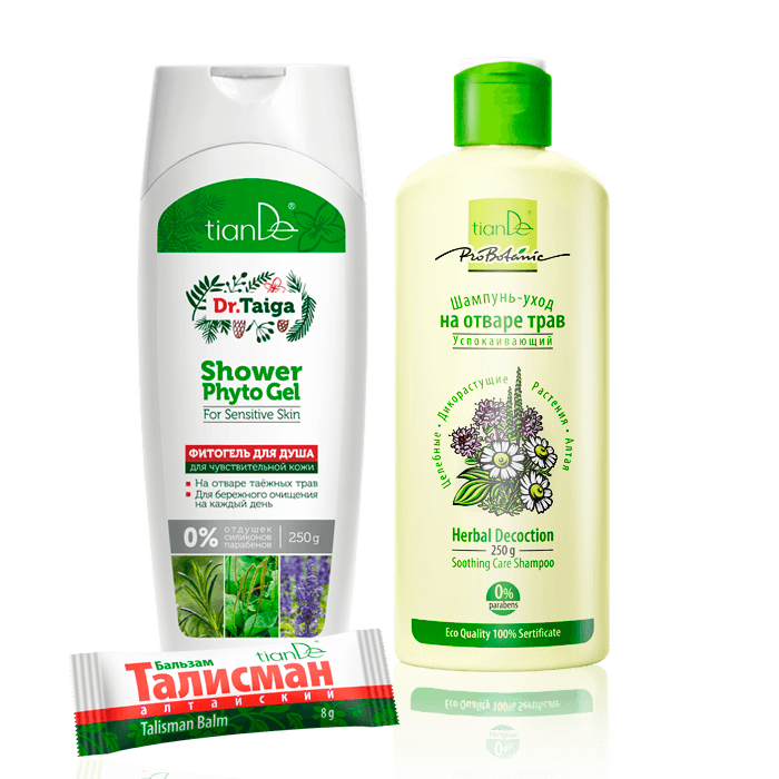 Стань ближе к природе с целым набором средств на основе натуральных компонентов. Фитогель для душа, шампунь-уход на отваре трав и бальзам «Талисман» – в их основе эффективные растения Алтая, которые будут заботиться о красоте твоих волос и нежности кожи. Условия Купи фитогель для душа для чувствительной кожи + успокаивающий шампунь-уход на отваре трав – В ПОДАРОК бальзам «Талисман»! 1 + 1 = 3
