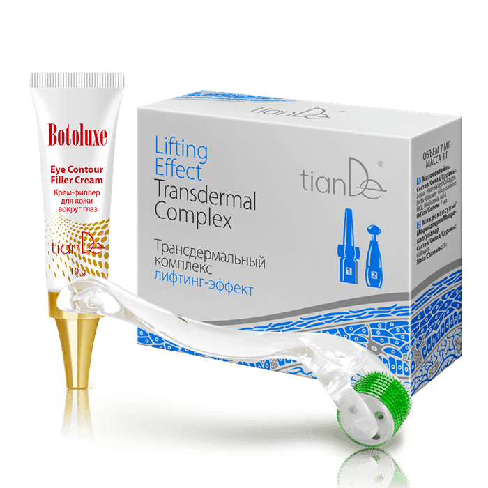 Омоложение кожи возможно в домашних условиях! Для этого требуются мезороллер и действенные средства! Микроиглы мезороллера изготовлены из качественной медицинской стали. Прибор стимулирует синтез коллагена и эластина, уменьшает количество и глубину морщин, а также повышает эффективность трансдермальных комплексов корпорации. Бери два продукта и забирай в подарок крем-филлер для кожи вокруг глаз, который обладает мгновенным визуальным лифтинг-эффектом. Условия Купи 2 продукта: мезороллер + трансдермальный комплекс лифтинг-эффект - В ПОДАРОК крем-филлер для кожи вокруг глаз Botoluxe! 1 + 1 = 3