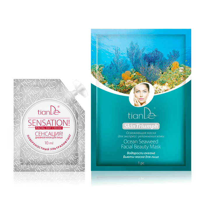 Мечтаешь, чтобы макияж ложился идеально, а на лице не было ни морщинок, ни следов усталости? Твоя мечта может исполниться! Дневной крем для лица «Сенсация» оказывает мгновенный визуальный лифтинг-эффект, безупречно готовит кожу к нанесению мейкапа, а еще экономит твой бюджет! Только сейчас за покупку крема забирай бонусом маску «Скин Триумф». Условия Купи дневной крем для лица «Сенсация» – В ПОДАРОК бьюти-маска для лица «Водоросли океана»! 1 = 2