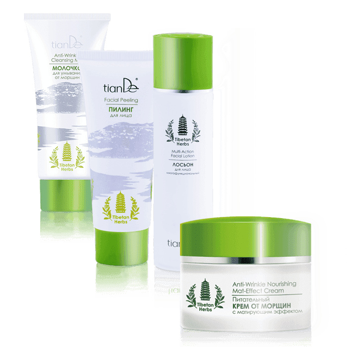 При покупке набора Tibetan Herbs TianDe: Пилинг для лица и Молочка для умывания от морщин и многофункционального Лосьона для лица - Питательный крем от морщин с матирующим эффектом в подарок