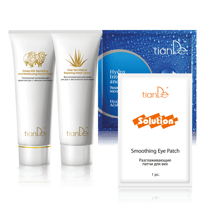 При покупке Крема для рук с овечьим молоком и Восстанавливающего крема для рук с экстрактом алоэ вера и Тонизирующей маски с омолаживающим эффектом «Лотос» - в подарок Разглаживающие патчи для век