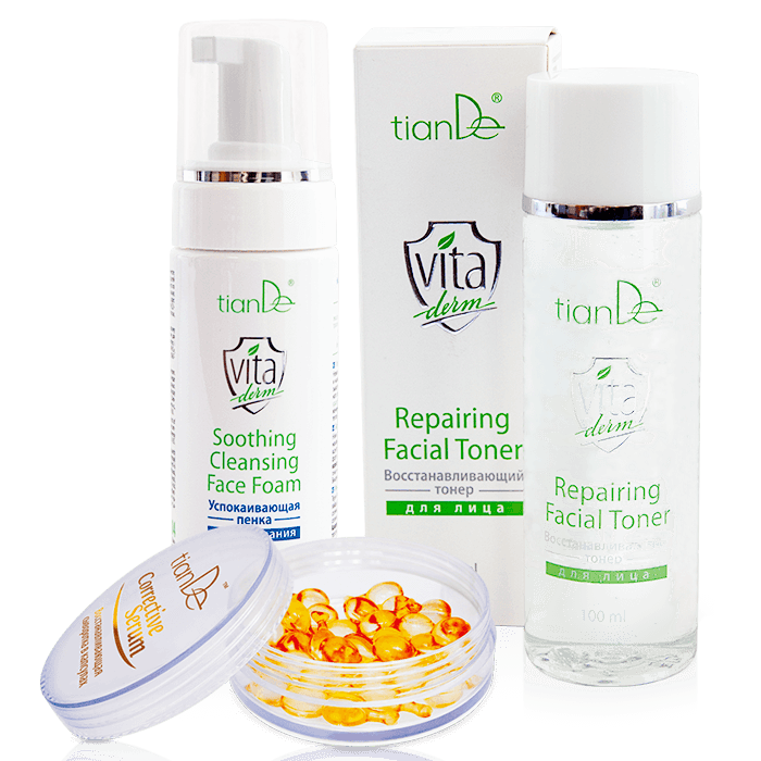Твоя кожа чувствительна? Ей нужен надежный «щит» и бережный уход! Продукты серии Vita Derm помогут успокоить капризную кожу, восстановят и обеспечат ей надежную ежедневную защиту. За покупку пенки для умывания и тонера для лица (это первый этап увлажнения) бонусом ты получишь полноценный уход – восстанавливающую сыворотку в капсулах. Условия Купи 2 средства серии Vita Derm: успокаивающую пенку для умывания + восстанавливающий тонер для лица – В ПОДАРОК восстанавливающая сыворотка для лица в капсулах!