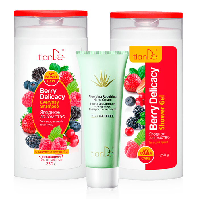 Любишь сочные ароматы в своей ванной, когда с головы до пяточек твое тело словно окутывает ягодное лакомство?.. Малина, ежевика, черника, земляника, брусника и клюква – весь этот «витаминный» набор собран в продуктах серии My Family Care от TianDe. Универсальный шампунь и гель для душа – удовольствие и уход одновременно! Приятным бонусом к «Ягодному лакомству» станет восстанавливающий крем для рук с экстрактом алоэ вера. Условия Купи 2 средства «Ягодное лакомство»: универсальный шампунь + гель для душа – В ПОДАРОК восстанавливающий крем для рук с экстрактом алоэ вера!