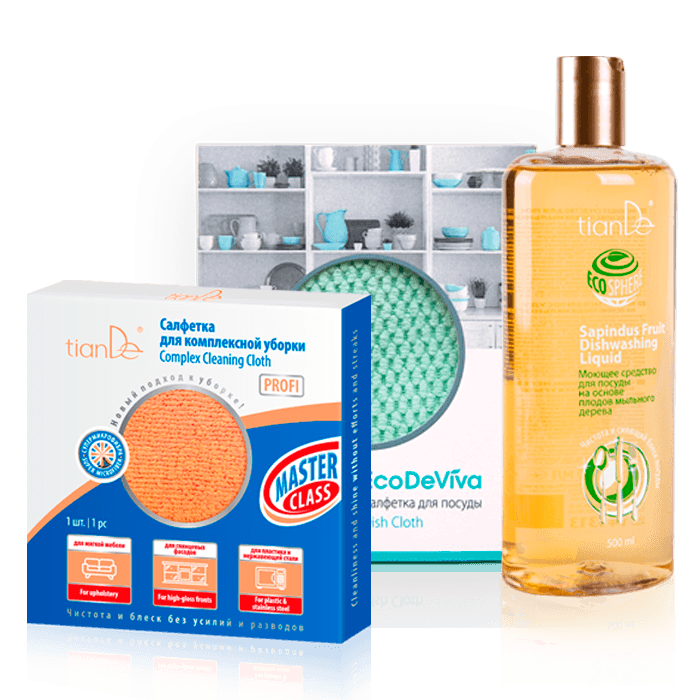 Средства для чистоты в доме должны быть не только эффективными, но и безопасными для здоровья человека и окружающей среды. Корпорация TianDe – за здоровую планету, поэтому в ассортименте компании целая линейка безопасных средств для дома, хит которой – моющее средство для посуды на основе плодов мыльного дерева. Натуральное, биоразлагаемое и гипоаллергенное! Эффект усилит «кухонный гаджет» – салфетка для посуды из супермикрофибры. Попробуй оба средства – бонусом забирай салфетку для комплексной уборки PROFI. Условия Купи 2 средства: моющее средство для посуды на основе плодов мыльного дерева + салфетку для посуды – В ПОДАРОК салфетка для комплексной уборки PROFI!