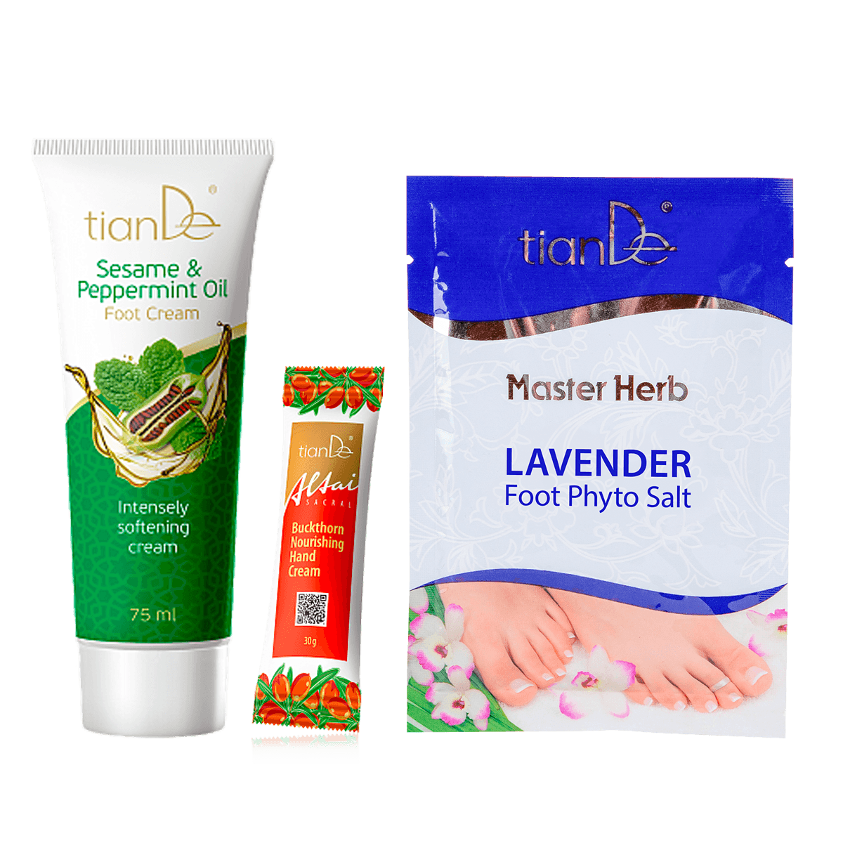 Нежные ручки, мягкие и гладкие пяточки… Чтобы они всегда оставались такими, балуй их домашними спа-процедурами. Запасайся арсеналом средств ухода от TianDe! Для ухода за кожей рук – облепиховый питательный крем, для ухода за ножками – крем «Сезам и мятное масло». В подарок за покупку забирай солевую ванну для ног! Условия Купи крем для ног «Сезам и мятное масло» + облепиховый питательный крем для рук – В ПОДАРОК солевая ванна для ног «Лаванда»! 1 + 1 = 3