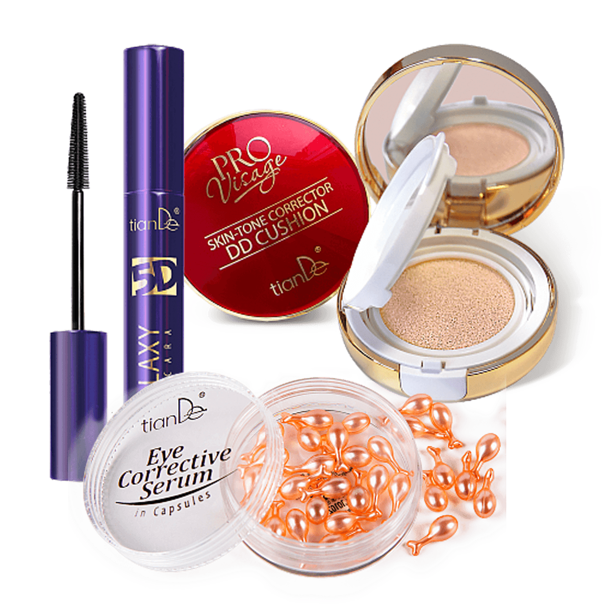 Тебе важно, чтобы в твоей косметичке была топовая качественная косметика, а эффект от ее применения приковывал взгляды? Выбирай косметику TianDe! Идеально ровная и ухоженная кожа лица, роскошный взгляд – все это легко с бьюти-средствами от компании красоты и здоровья! Для будущих комплиментов подарок прямо сейчас – дарим кушон для идеального тона! Условия Купи 2 средства: тушь для ресниц Galaxy Volume 5D + восстанавливающую сыворотку для кожи вокруг глаз в капсулах – В ПОДАРОК DD тональное корректирующее средство – кушон для светлой кожи! 1 + 1 = 3