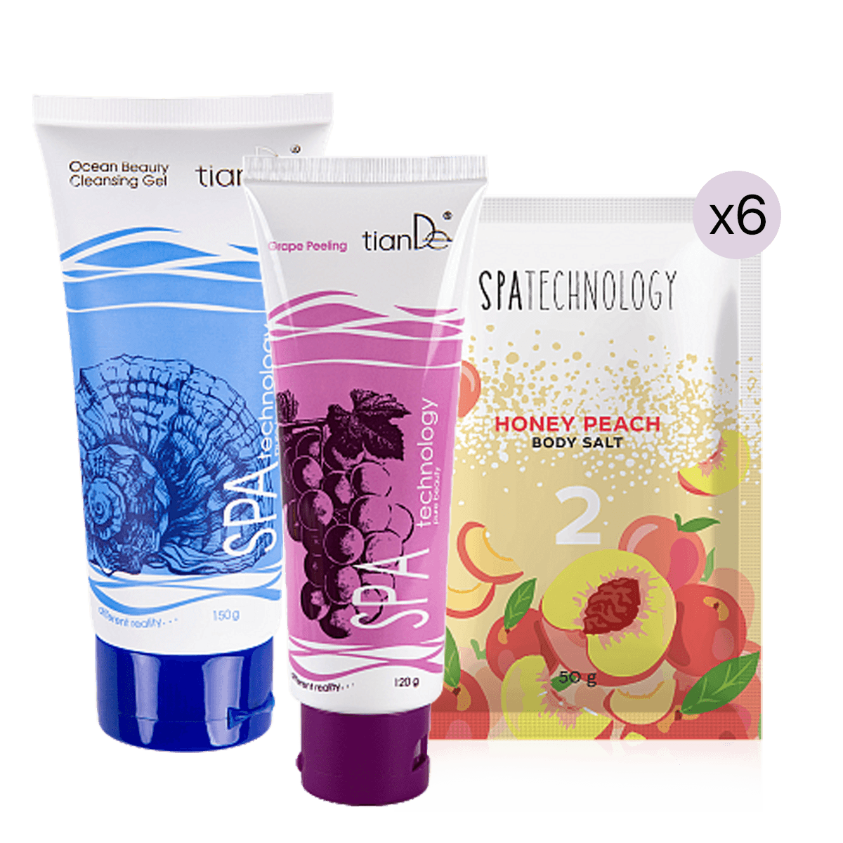 Нежнейшие текстуры и потрясающие ароматы, бережное очищение и деликатный уход – с коллекцией SPAtechnology от TianDe эта роскошь всегда будет под рукой! Гель для умывания, пилинг – бери два средства, бонусом забирай сразу 6 пакетиков соли для тела! Условия Купи 2 средства SPAtechnology: гель для умывания «Океан красоты» + виноградный пилинг – В ПОДАРОК 6 пакетиков соли для тела «Медовый персик» из этой же серии! 1 + 1 = 8