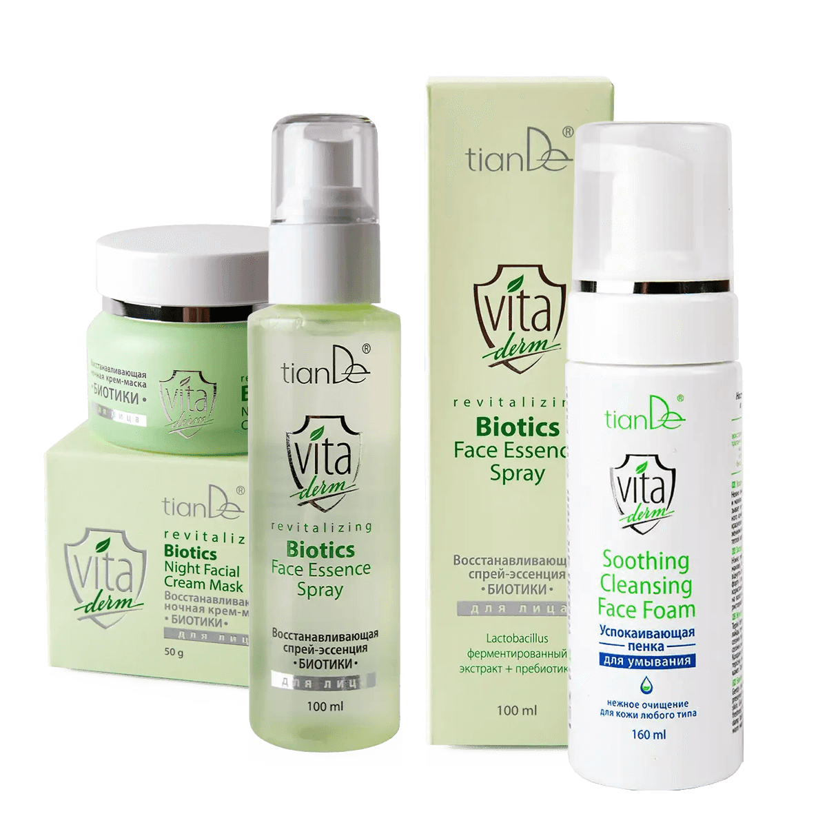 Краснота, дискомфорт, воспаление… Кожа капризничает? Восстанови баланс с помощью косметических средств для чувствительной кожи из коллекции Vita Derm. Продукты серии успокоят кожу, помогут восстановить ее микробиом, обеспечат надежную защиту. Забирай три средства Vita Derm по выгодной цене! Условия Купи 2 восстанавливающих средства для лица «Биотики»: ночную крем-маску + спрей-эссенцию – В ПОДАРОК успокаивающая пенка для умывания! 1 + 1 = 3