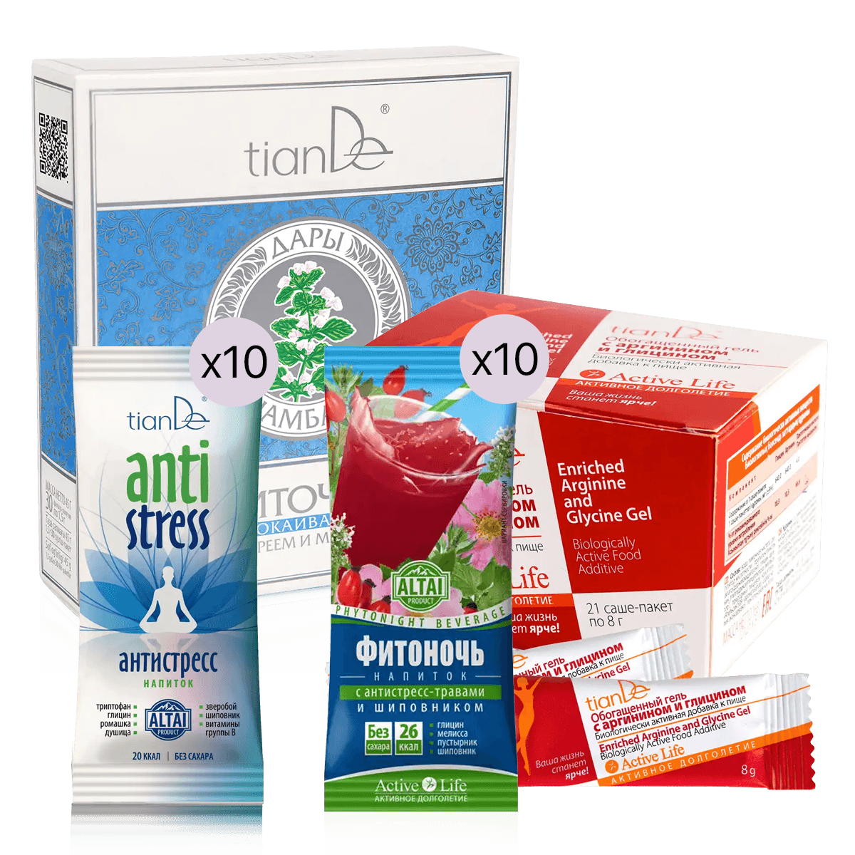 В набор «Антистресс» входят: обогащенный гель с аргинином и глицином; фиточай успокаивающий с кипреем и мелиссой; напиток «Фитоночь» (10 шт.); напиток «Антистресс» (10 шт.). Стресс – нормальная реакция организма на что-то новое или неожиданное. Но длительный стресс губителен для него. Кроме того, организм должен быть готов к правильной реакции на стрессовую ситуацию. Средства набора содержат компоненты, которые помогут организму противостоять стрессу и его негативным последствиям. На территории РФ маркированные товары можно приобрести только с онлайн-оплатой или частичной оплатой с бонусного счета.