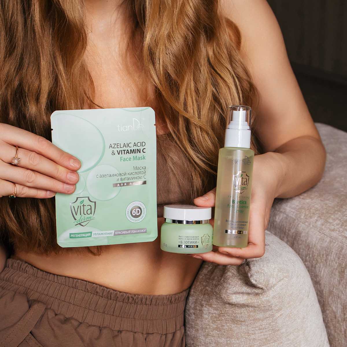 Сократить выраженные несовершенства и постакне, снизить проявления чувствительности кожи, благоприятно влияя на ее микробиом, – все это под силу азелаиновой кислоте! Именно этот ценный для кожи актив лежит в основе маски для лица из коллекции VitaDerm. В комбинации с BHA-салициловой кислотой и бетаин-салицилатом азелаиновая кислота оказывает мягкий отшелушивающий эффект, препятствует образованию комедонов, регенерирует кожу, улучшает ее тон и текстуру. Маска содержит комплекс из 6 видов гиалуроновой кислоты, витамин С, ниацинамид, аргинин, аминокислоты кунжута и аллантоин, благодаря которым: - восстанавливает оптимальный уровень увлажнения; - придает эластичность; - смягчает морщины; - дарит ощущение обновленной и свежей кожи. Маска для лица с азелаиновой кислотой и витамином С подходит для любого типа кожи, в том числе чувствительной и склонной к раздражению. Наслаждайся красивой и здоровой кожей!