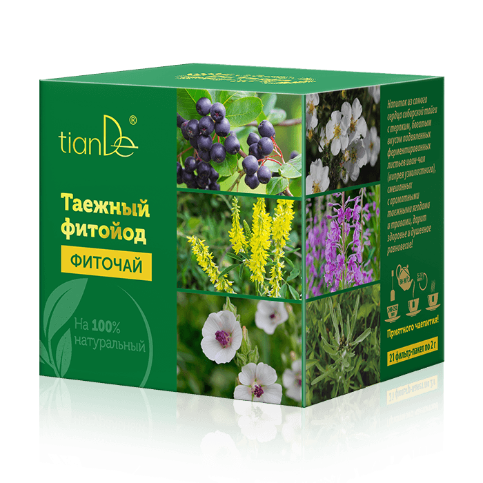 Зачем организму йод? Для синтеза гормонов щитовидной железы, которая регулирует его работу! Проще говоря, щитовидная железа определяет, с какой частотой будет биться сердце, сколько съеденной пищи отложится в виде гликогена (энергетический запас), а сколько – в виде жира, будет ли человек мерзнуть в холода или нет… Картина планетарной нехватки йода сегодня выглядит очень масштабно – почти 30% населения земли подвержены риску йододефицитных заболеваний. Фиточай от TianDe «Таежный фитойод» поможет поддержать организм! На 100% натуральный, без ароматизаторов и усилителей вкуса – этот напиток с изумительным ароматом и массой полезных свойств по достоинству оценит каждый! В его составе редкие травы, ягоды и плоды из самого сердца сибирской тайги. Фиточай: - содержит витамины, микро- и макроэлементы, важные для организма при пониженной функции щитовидной железы; - предупреждает слабость и быструю утомляемость, повышает работоспособность и поддерживает настроение в норме. Практически все растения, входящие в фиточай, собраны на Алтае, в одном из самых экологически чистых мест планеты. Они выросли в естественных условиях, вдали от промышленных зон. Почва там никогда не эксплуатировалась для посевов и не обрабатывалась удобрениями. Благодаря современной технологии обработки сырья травы сохраняют и отдают напитку максимум пользы. В каждой коробочке – 21 фильтр-пакет в индивидуальной упаковке! Любимый чай теперь всегда будет с тобой!
