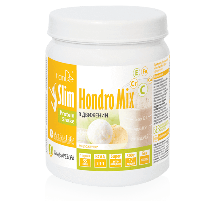 Это микс с нежным сливочным вкусом. Slim Hondro Mix – для тех, кому необходимо привести вес в норму, а также поддержать работу суставов. Именно они страдают больше всего при ударных физических нагрузках и при избыточной массе тела. Slim Hondro Mix содержит качественный белок в оптимальном соотношении: 55% сывороточного и 45% подсолнечного. Коктейль идеально подойдет спортсменам (и профессионалам, и любителям). Микс содержит натуральные аминокислоты, в том числе оптимальное количество самых важных и нужных для формирования тела – ВСАА. Это аминокислоты лейцин, изолейцин и валин. Именно этот комплекс поддерживает тело при стрессах и нагрузках, способствует наращиванию мышечной ткани. Аминокислоты ВСАА являются топливом во время тренировок и первыми приходят на помощь после них, восстанавливая мышечные волокна и уменьшая чувство усталости. Без сои, глютена, сахара, консервантов, красителей и синтетических премиксов – продукт содержит максимальное количество натуральных компонентов, в том числе и аминокислот. Приятный вкус коктейлю придает натуральный подсластитель – экстракт стевии. В одной порции – 11 граммов белка и всего 55 килокалорий! Комплекс «суставных» компонентов в составе коктейля поможет поддержать суставы и добиться всех поставленных целей, сохранив здоровье!