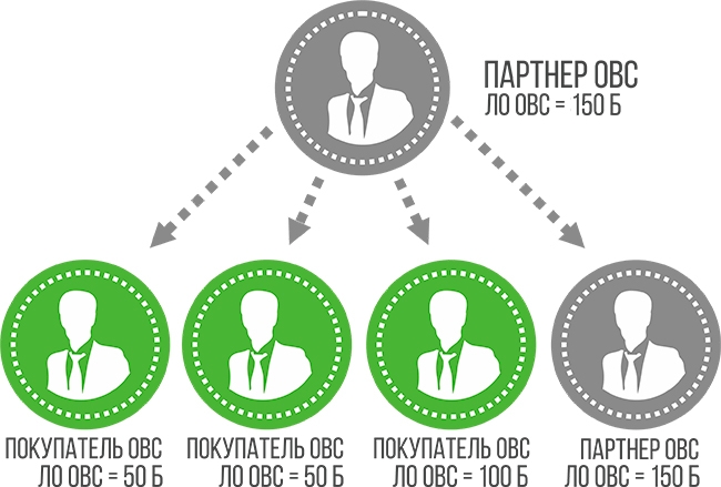 2 новых покупателя ОВС, приглашенных лично вами, приобрели в ОВС продукцию на 50 баллов, еще 1 новый покупатель ОВС – на 100 баллов. Кроме того, вы зарегистрировали нового партнера ОВС (который совершил на сайте единовременную покупку продукции на 150 баллов).