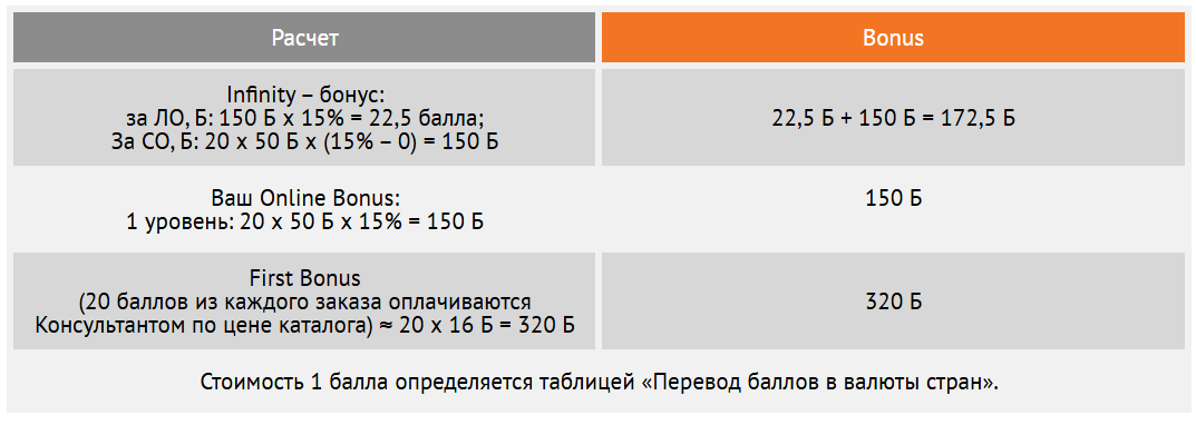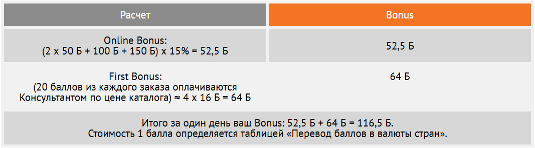 First Bonus – вознаграждение Спонсору в размере 28% от суммы первого заказа на 20 баллов по цене каталога, совершенного Консультантом его первого уровня в Online Business Center и оплаченного им на сайте, курьеру наличными или наложенным платежом (за исключением заказов, оплаченных при получении в ЦИЗ).