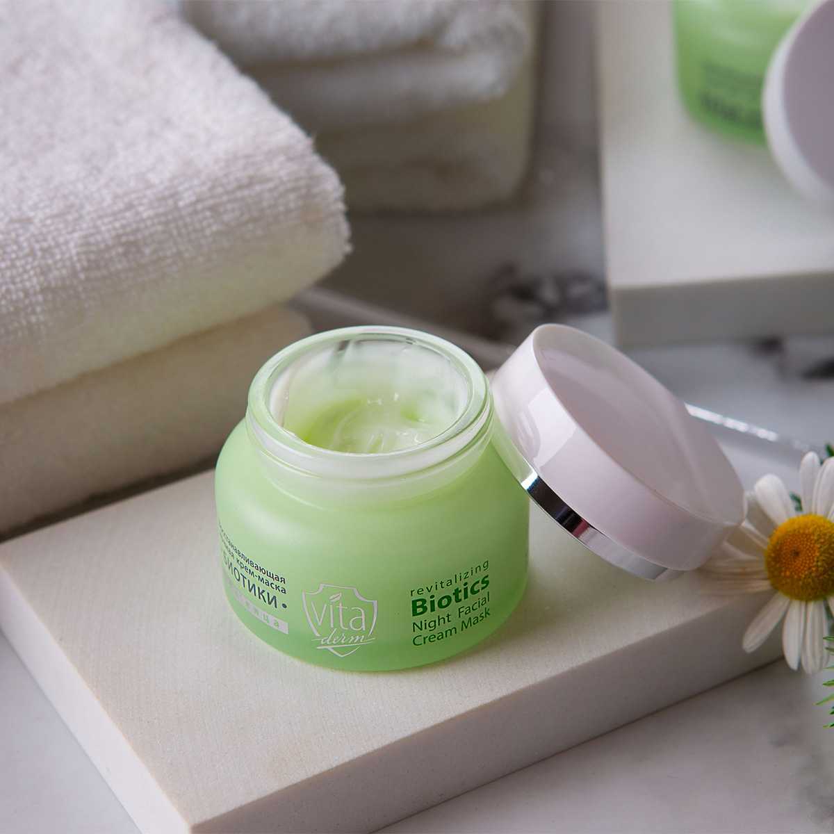 Легкое покалывание, зуд, стянутость, краснота, выраженное воспаление… По статистике, 77% людей сталкиваются с проблемой чувствительной кожи. Ночная крем-маска для лица «Биотики» создана, чтобы успокоить капризную кожу! Эффективное средство из коллекции Vita Derm, разработанной для чувствительной кожи: - способствует восстановлению микробиома кожи; - устраняет чувство стянутости и шелушения; - восстанавливает и буквально преображает увядающую, сухую, чувствительную, склонную к раздражению и покраснению кожу; - укрепляет ее барьерные функции и повышает иммунитет; - успокаивает, улучшает эластичность тканей. Восстанавливающая ночная крем-маска содержит современные комплексы на основе пребиотиков, лактобактерий, уникальной водоросли хлореллы, а также 4D-комплекс из 4 видов гиалуроновой кислоты. Оптимальное сочетание активных ингредиентов активизирует процессы восстановления кожного барьера, обеспечивает глубокое и длительное увлажнение, а также смягчение морщин и антиэйдж-эффект. Идеально подходит для любого возраста и всех типов кожи.
