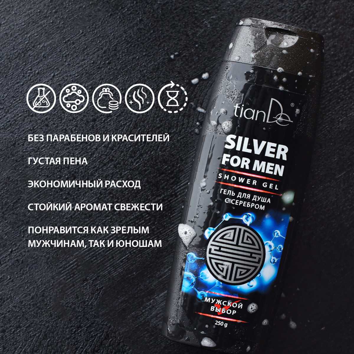 Гель для душа создан с учетом особенностей мужской кожи. В состав средства входит дезинфицирующее и бактерицидное коллоидное серебро, которое уничтожает микроорганизмы и препятствует появлению неприятного запаха, обеспечивая продолжительный дезодорирующий эффект. Кроме того, в сочетании с другими активными компонентами геля серебро снимает раздражения на коже, смягчает ее. Средство отлично пенится. Обладает стойким, но очень деликатным ароматом свежести. Понравится как зрелым мужчинам, так и юношам. Не содержит парабенов и красителей.