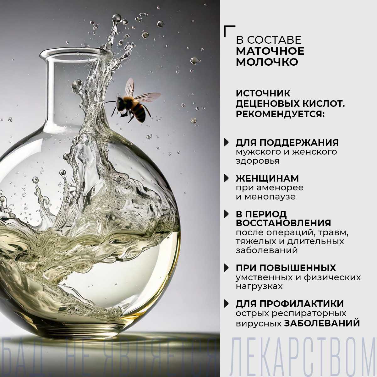 Живи яркой и активной жизнью! «Женьшень и маточное молочко» – специальный функциональный комплекс, разработанный для мужчин и женщин. - Мужчинам он помогает поддерживать активность и мужскую силу. - Женщинам – сохранять молодость, чувственность и привлекательность. Активные компоненты продукта оказывают общеукрепляющий эффект и усиливают иммунитет, а также оказывают еще целый ряд положительных действий на организм. Экстракт корня женьшеня (источник генсенозидов) – сильный адаптоген: - помогает организму лучше переносить неблагоприятные условия, в том числе стресс; - повышает умственную и физическую работоспособность; - стимулирует обмен веществ и энергии, клеточную активность. Маточное молочко (источник деценовых кислот) рекомендуется: - для поддержания мужского и женского здоровья; - женщинам при аменорее и менопаузе; - в период восстановления после операций, травм, тяжелых и длительных заболеваний; - при повышенных умственных и физических нагрузках; - для профилактики острых респираторных вирусных заболеваний. БАД. Не является лекарством.