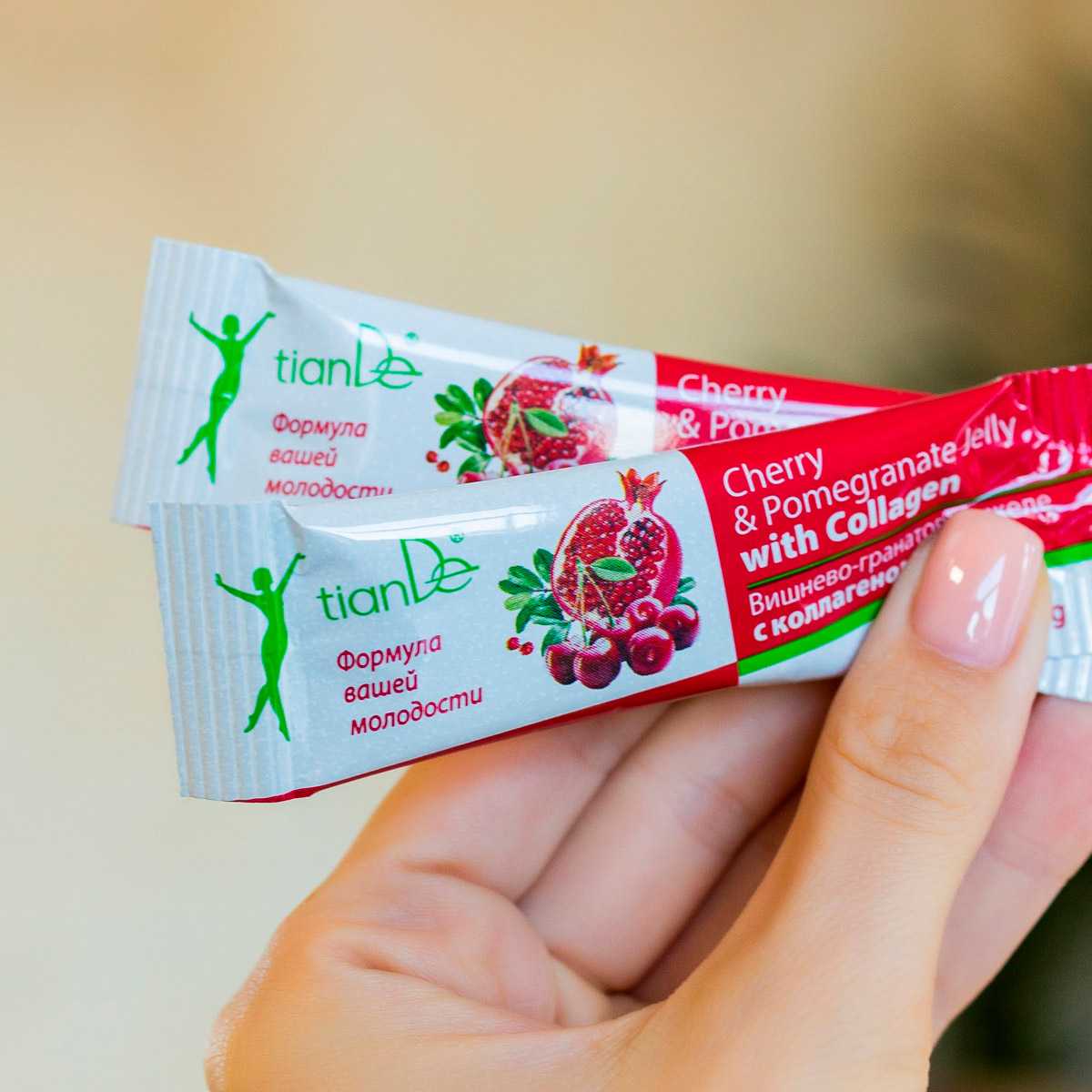 В погоне за молодостью многие, особенно женщины, готовы практически на все – дорогостоящие косметические процедуры, скальпель пластического хирурга… Однако все эти методы направлены лишь на внешнее устранение проблемы – внутри организм остается прежним. Возможно ли «омолодиться» не только снаружи, но и изнутри? Да, если регулярно «насыщать» свой организм коллагеном. Коллаген – это белок, основа соединительной ткани всего организма, количество которого неизбежно снижается с возрастом. Нужна его доставка извне! Теперь сделать это легко и удобно – с помощью вишнево-гранатового желе с коллагеном от TianDe! Продукт не содержит ГМО (генно-модифицированных организмов), красителей и сахара. Благодаря содержанию натурального гранатового и вишневого сока желе имеет приятный ягодный вкус! В его составе – натуральный гидролизованный коллаген с высокой степенью усвояемости – более 80%. Коллаген – это: - активность и гибкость – поддерживает суставы, связки и мышцы; - красота и молодость – заботится о состоянии кожи, волос и ногтей; - отличное самочувствие – благотворно воздействует на состояние сердечно-сосудистой системы. Натуральный витамин С, содержащийся в гранатовом и вишневом соке, помогает усваивать коллаген максимально эффективно.