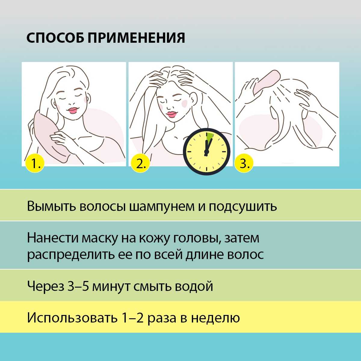 Вымыть волосы шампунем и подсушить. Нанести маску на кожу головы, затем распределить ее по всей длине волос. Через 3–5 минут смыть водой. Использовать 1–2 раза в неделю.