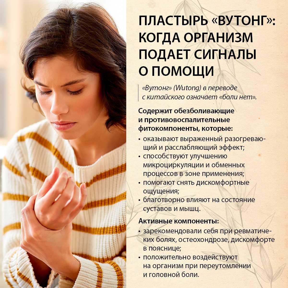 Как ты справляешься с болью? Можно принять таблетку и временно заглушить проблему или воздействовать на ее причину, используя проверенные традиции восточной медицины. «Вутонг» (Wutong) в переводе с китайского языка означает «боли нет». Работая мягко и вместе с тем интенсивно, он поможет вернуть радость свободы движений. Фитокомпоненты, входящие в состав пластыря, обладают противовоспалительными и анальгезирующими свойствами: - оказывают выраженный разогревающий и расслабляющий эффект; - способствуют улучшению микроциркуляции и обменных процессов в зоне применения; - помогают снять дискомфортные ощущения. «Вутонг» эффективен даже при однократном использовании. Хочешь усилить результат? Применяй его курсом. Фитопатч работает по принципу трансдермальной* терапии и обладает накопительным эффектом. Это своего рода «сухая капельница»: экстракты растений через кожу взаимодействуют с организмом человека, оказывая положительное влияние на его физиологическое и энергетическое состояние. * Трансдермальная – от слов trans – «через» (лат.) и derma – «кожа» (греч.).
